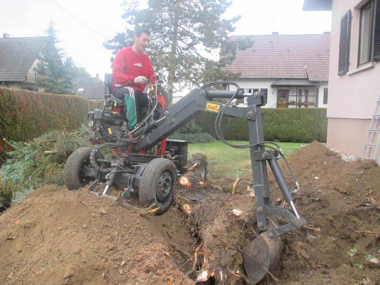 - La dessoucheuse va rogner la souche, mais il restera des racines en terre, vous devrez finir le travail manuellement à la pioche pour tout nettoyer.